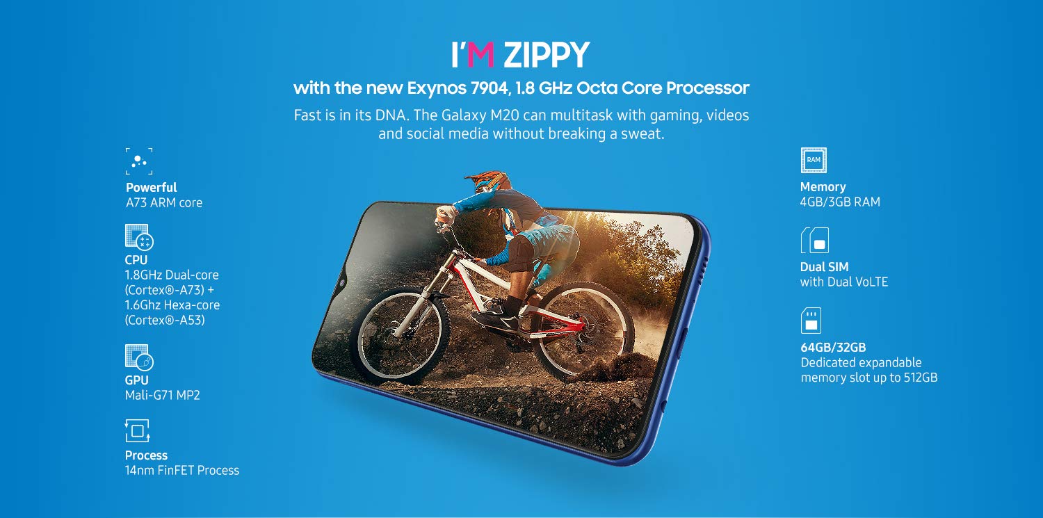 The Galaxy M20 is powered by the new Exynos 7905 octa-core chipset that features 2 Cortex A73 cores clocked at 1.8GHz and 6 Cortex-A53 cores clocked at 1.6GHz. As noted earlier, this is an under-clocked Exynos 7885 chipset that you see in the likes of Galaxy A7 2018, Galaxy A8 2018 and Galaxy A8+ 2018.