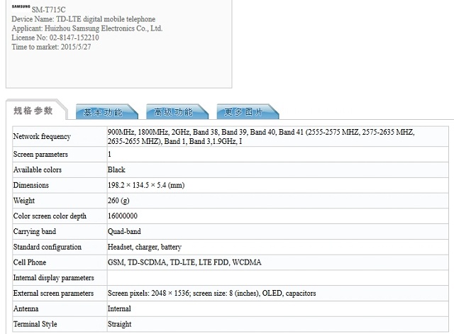 The alleged Galaxy Tab S2 8.0 has been approved by TENAA, the Chinese regulatory and certification database. The device is listed to boast of an 8 inch AMOLED display with a resolution of 1536×2048 pixels and 4:3 aspect ratio.