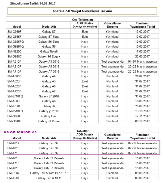 | Galaxy Tab S2 9.7 2015 (3G/LTE) | SM-T815 | Nougat is expected. Samsung has confirmed the update. | 7th – 24th April 2017 |