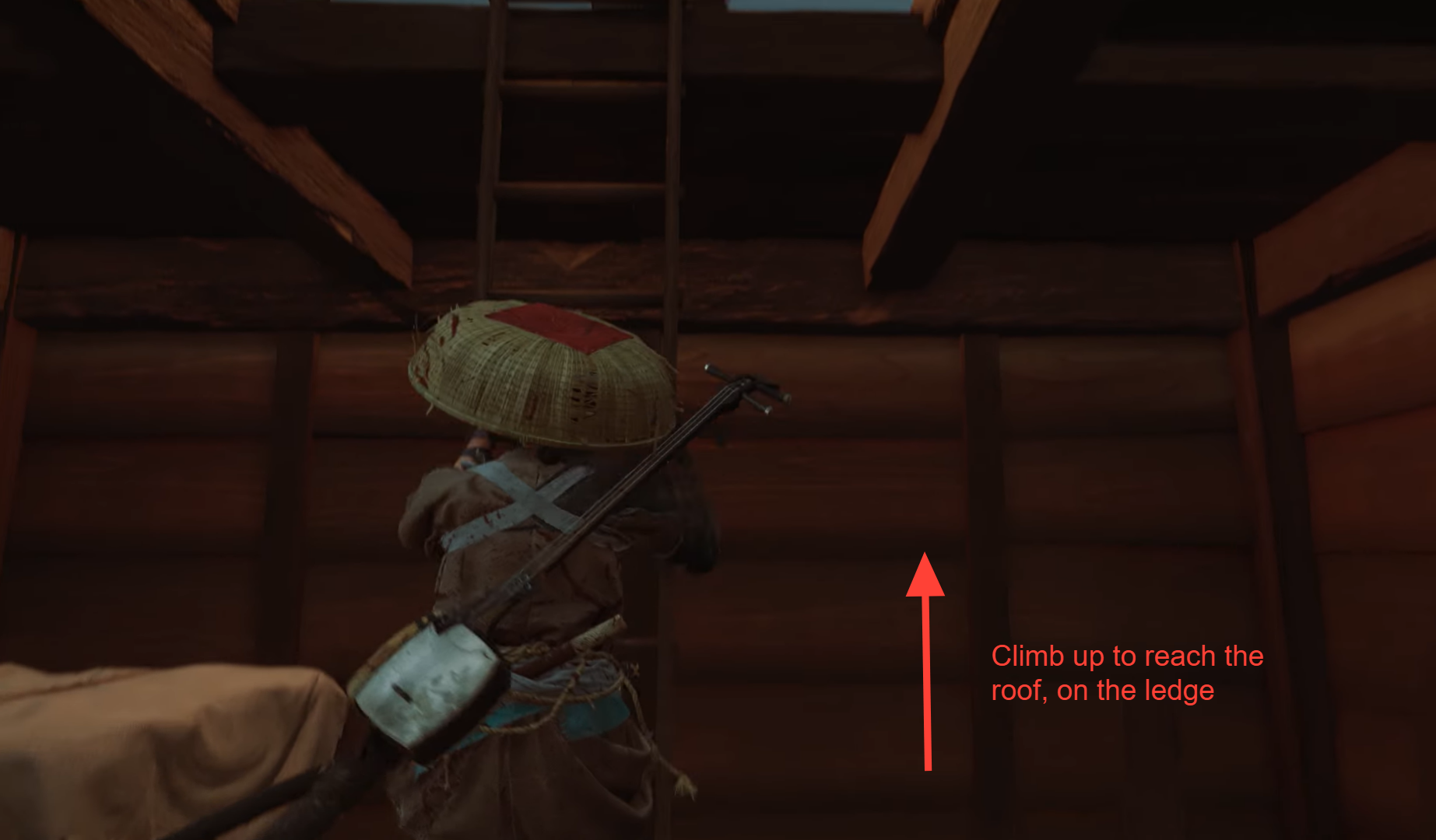 Speak to the rescued samurai, who guides you: "Up that ledge and past the drums." Climb the wall behind him and enter the opening near the drum to reach the cells.