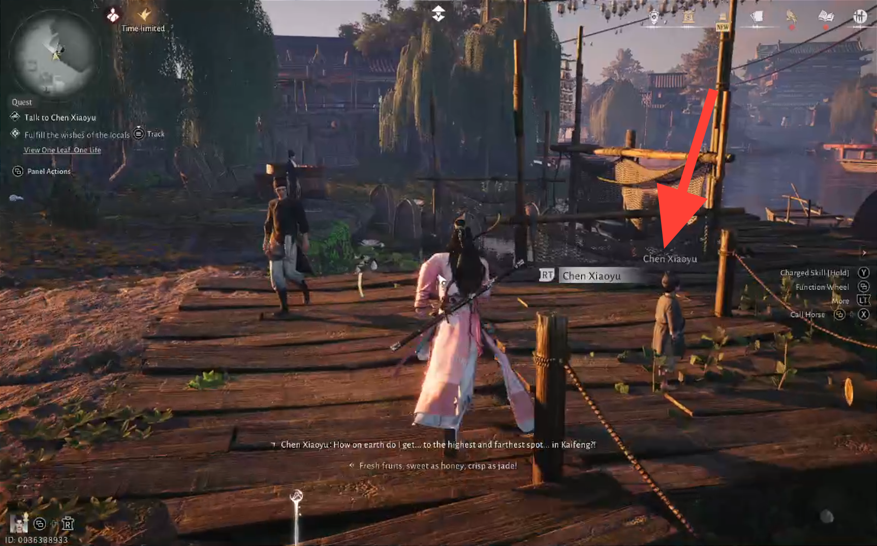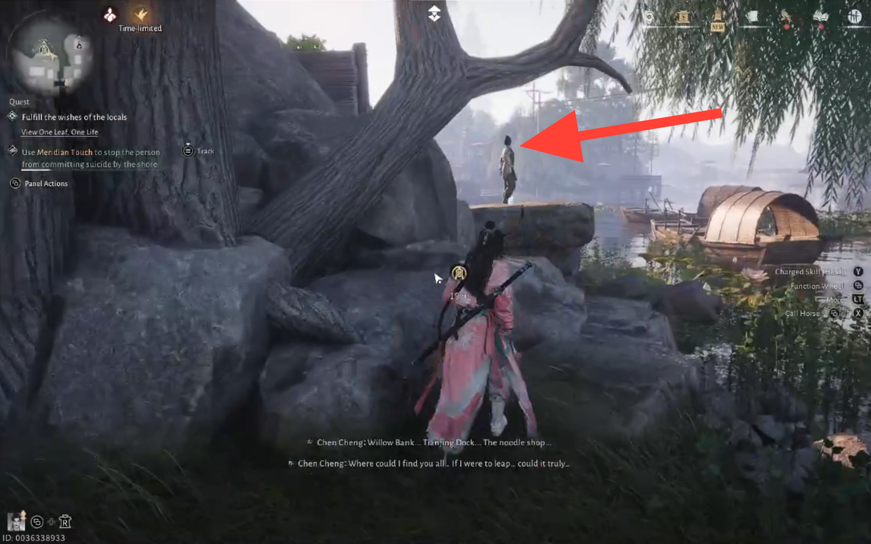 Head to the quest area and use Meridian Touch to immobilize Chen Cheng, preventing him from jumping into the water.
