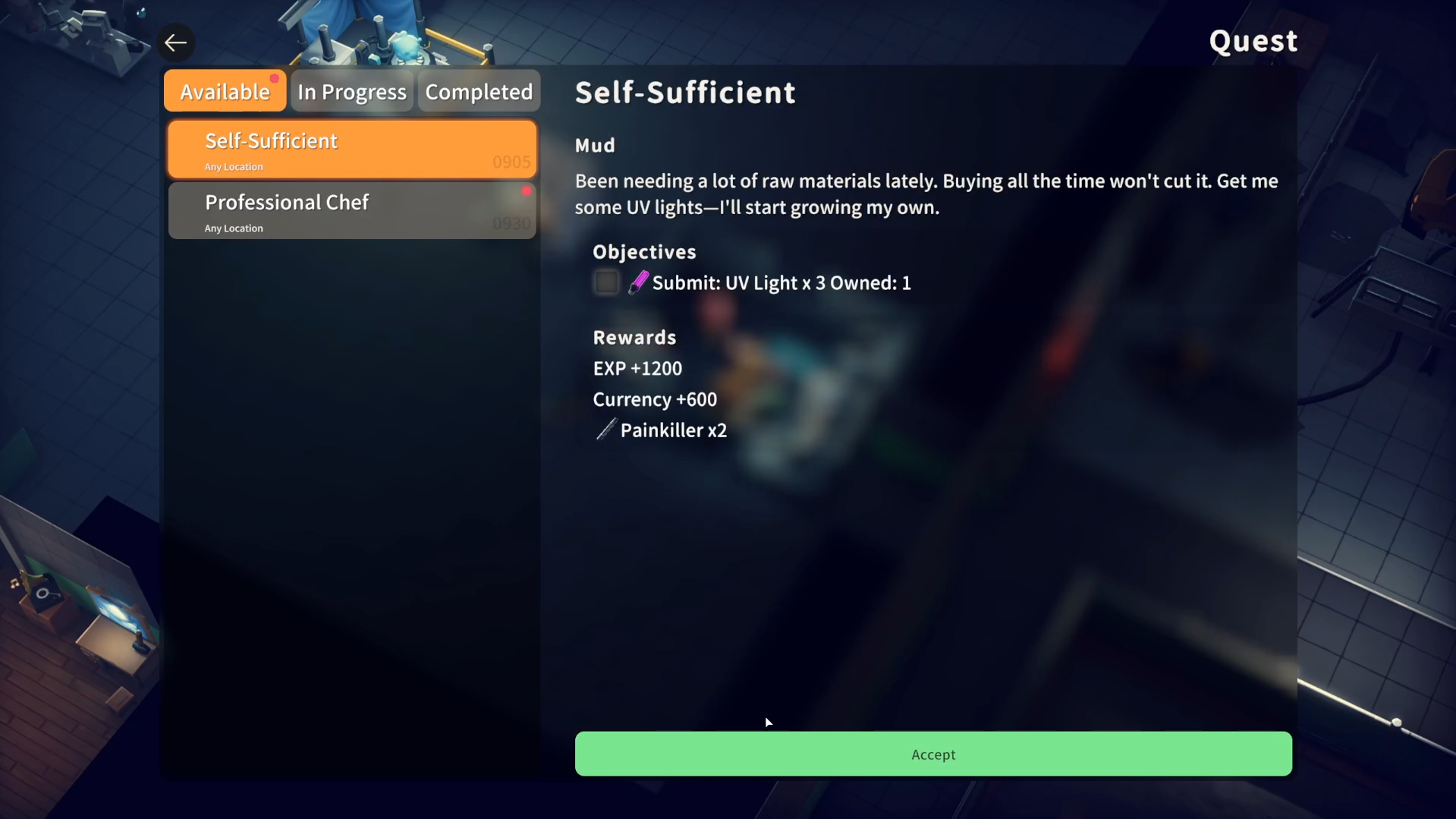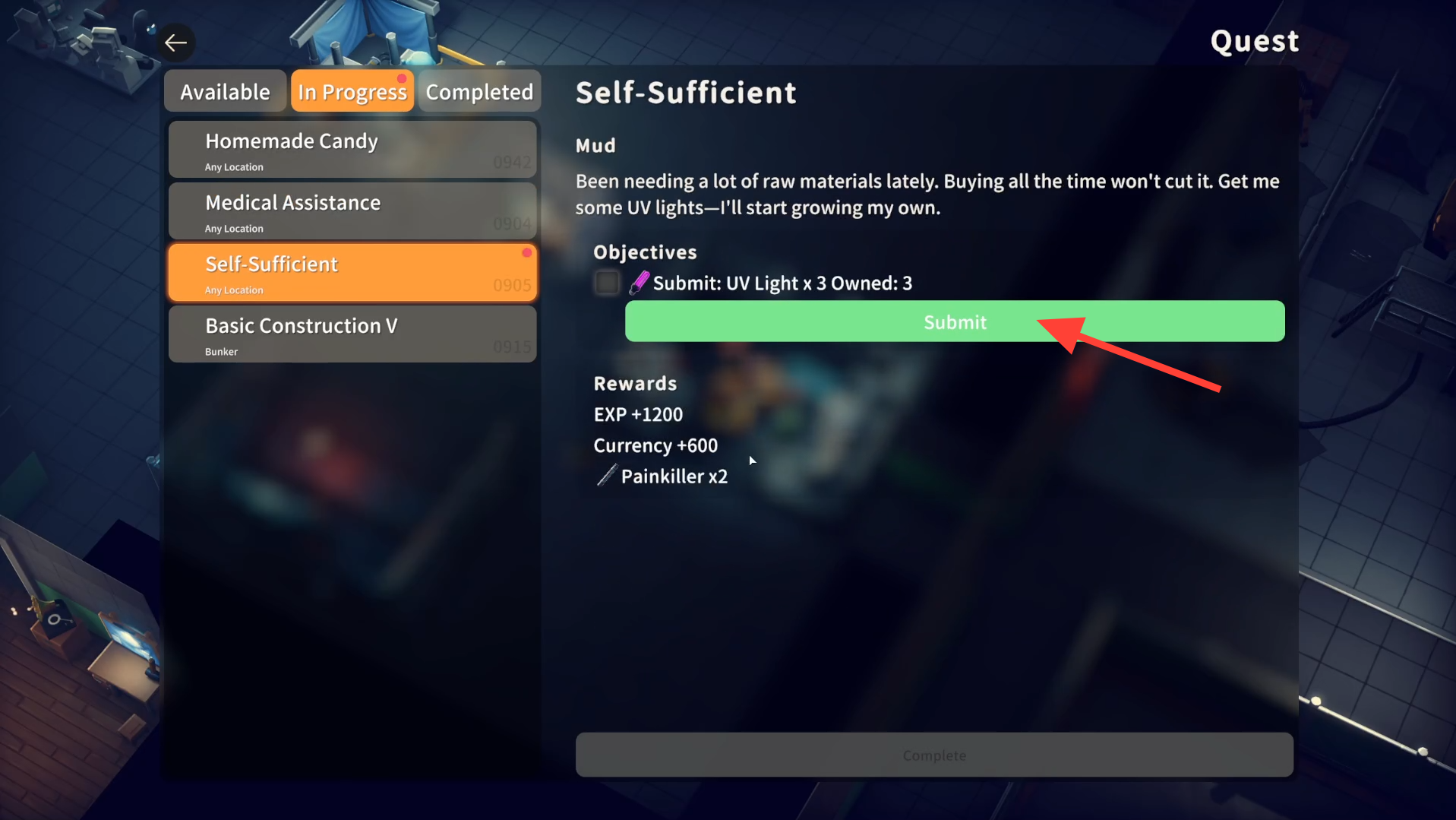 Mud gives this quest, asking for UV lights to start his own material growth process. This quest can be started from any location and rewards XP, currency, and medical items.