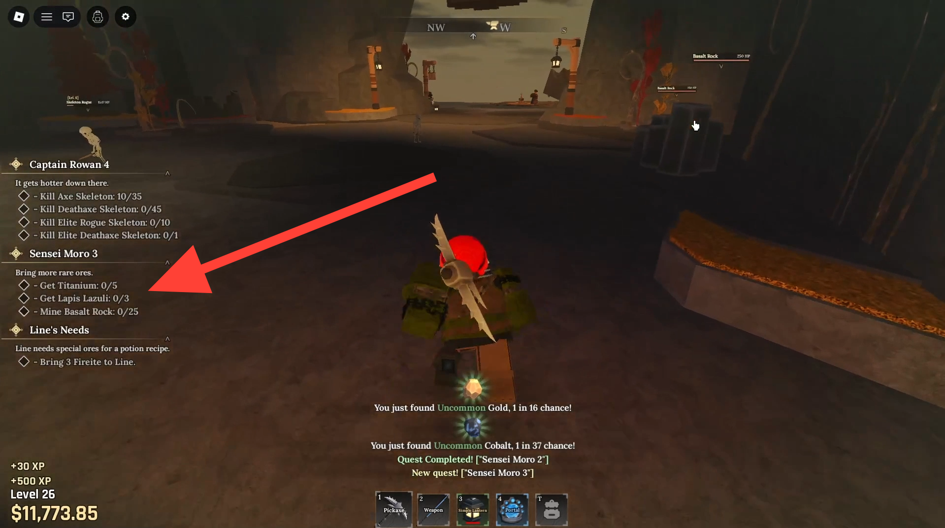 Get ready to push further into the Descent's Beginning area of the Forgotten Kingdom in The Forge on Roblox with the “Sensei Moro 3” quest. This quest automatically unlocks after Sensei Moro 2, challenging you to mine 25 Basalt Rocks while gathering rarer Titanium and Lapis Lazuli to progress toward even tougher challenges ahead.