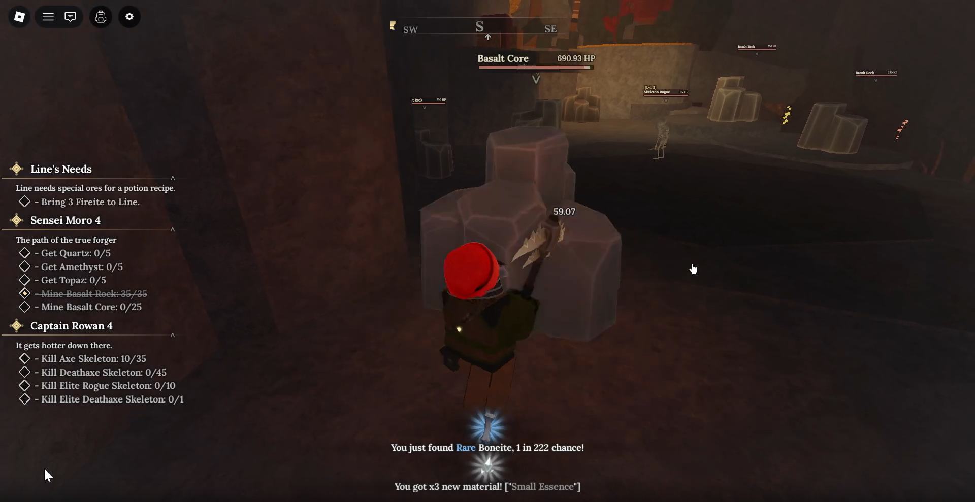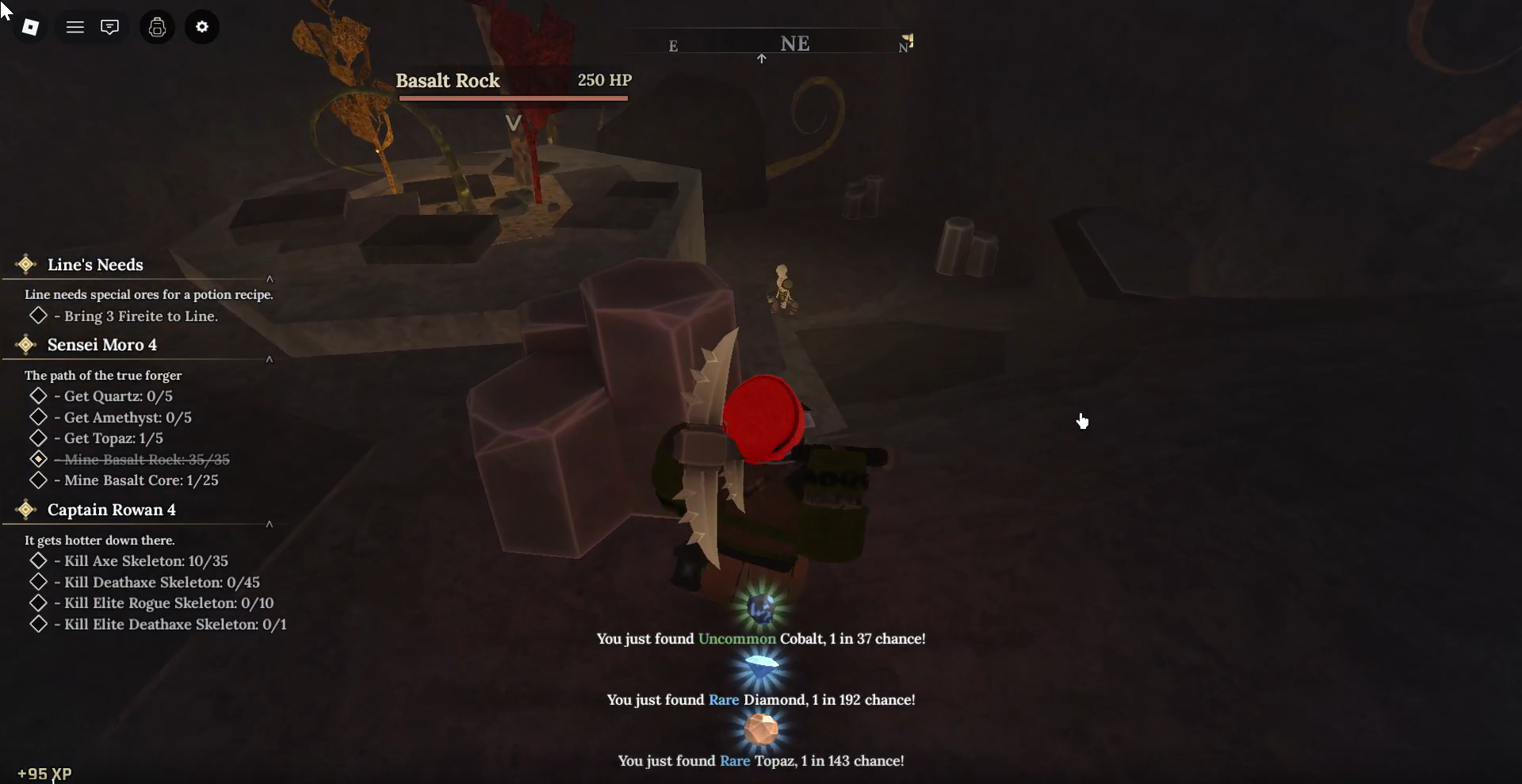 You have to mine 35 basalt rocks and 25 basalt cores, and collect quartz, amethyst, and topaz to move forward.