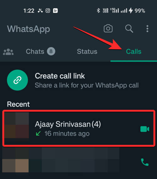 Alternatively, you can also start a video call by going to the Calls tab at the top and tapping on the contact you wish to video call from your recent call log.