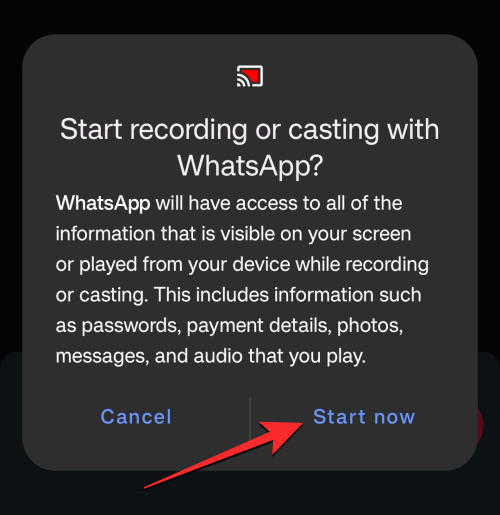 On doing that, you will see a prompt on your screen asking you to confirm whether you wish to commence screen recording. To proceed, tap on Start now on this prompt box.