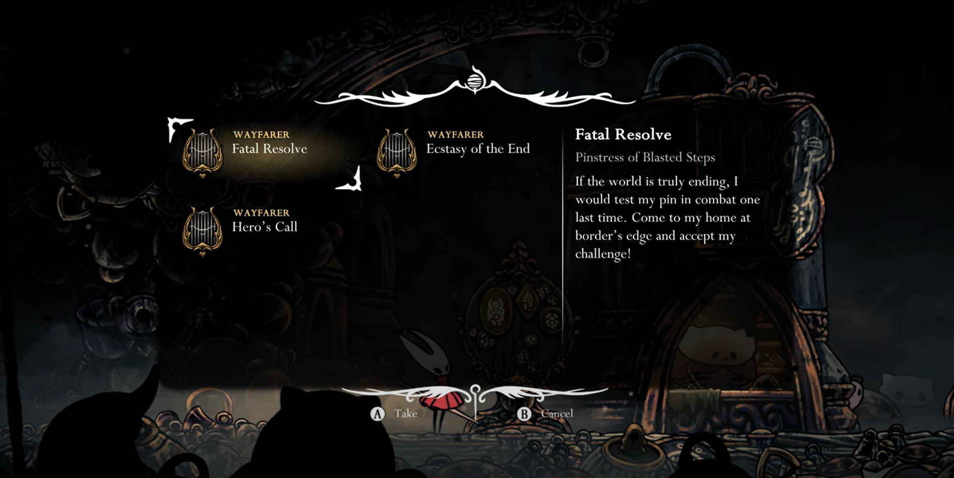 There are a lot of quests you can undertake in Silksong. Fatal Resolve involves the Pinstress who wishes for one last duel. The quest takes you to the Blasted Steps where Pinstress resides to the top of the mountain in Mount Fay where the duel will happen. And you will be awarded the Pin Badge.