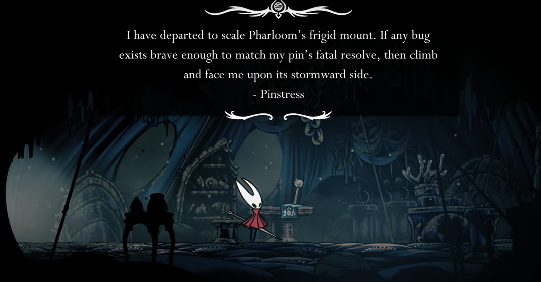 Interacting with the Pin will reveal a message from Pinstress, that she has gone to the mountain top in Mount Fay and invites you to come fight there.