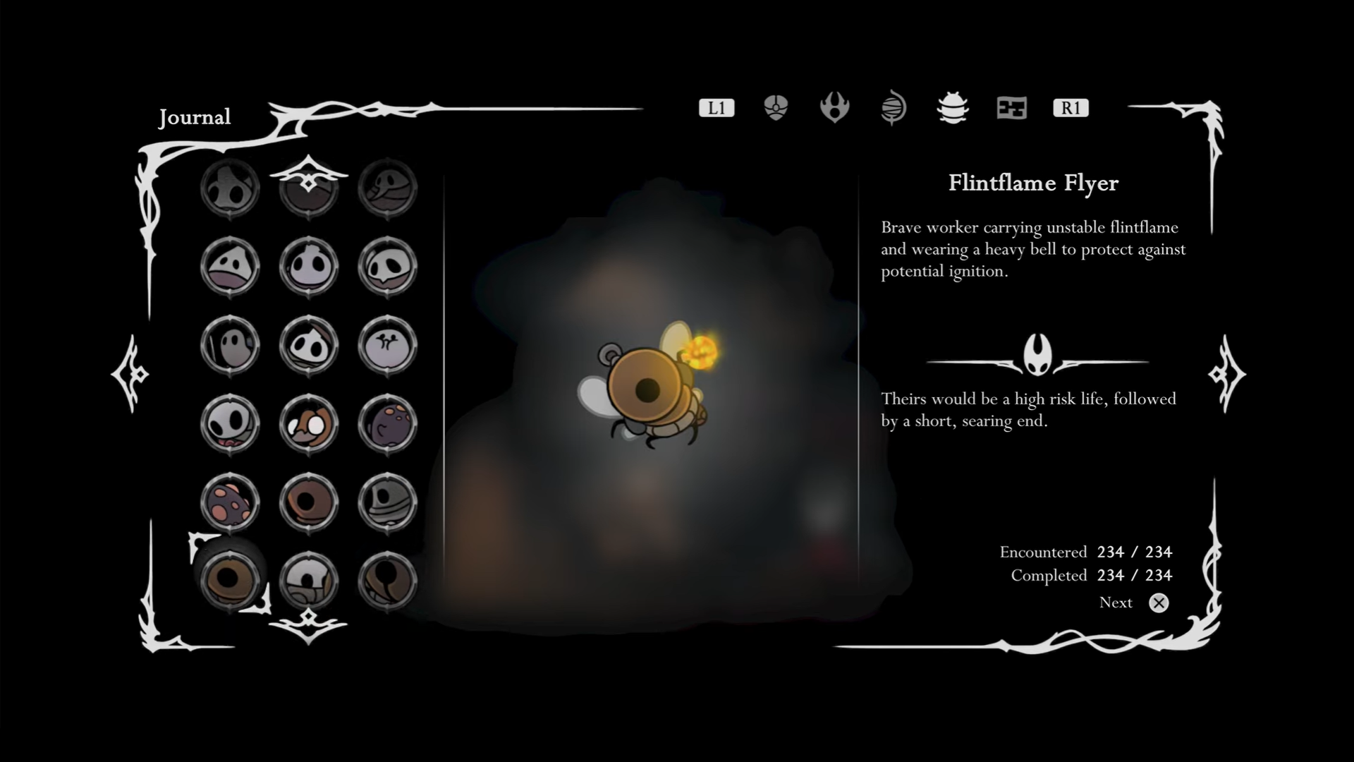 The Hunter’s Journal in Silksong contains 234 entries, making it larger and more diverse than the original Hollow Knight version. These entries cover: