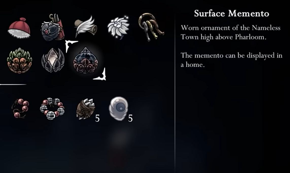 Surface Memento | A delicate relic tied to Pharloom’s ancient past | Nameless Town, house on the right | Decorates Bellhart home, reflects lore | Play Needolin to drop from ceiling; use Silk Soar for platforming. |
