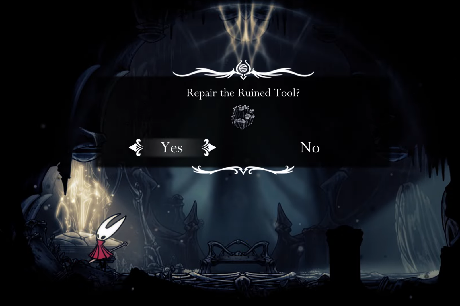 When given the Ruined Tool, each NPC repairs it into a working Silkshot—a tool that lets Hornet fire threads of silk as a ranged weapon. However, the costs and performance differ.