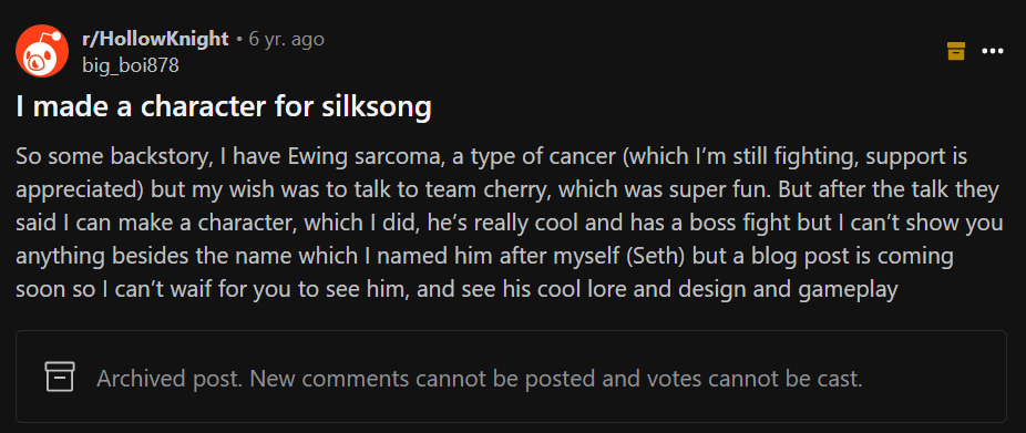 Unfortunately, Seth passed away in 2019, well before he could see his creation in Silksong. But players knowing his legacy will continue to play and interact with his spirit and his creation for years to come. RIP!