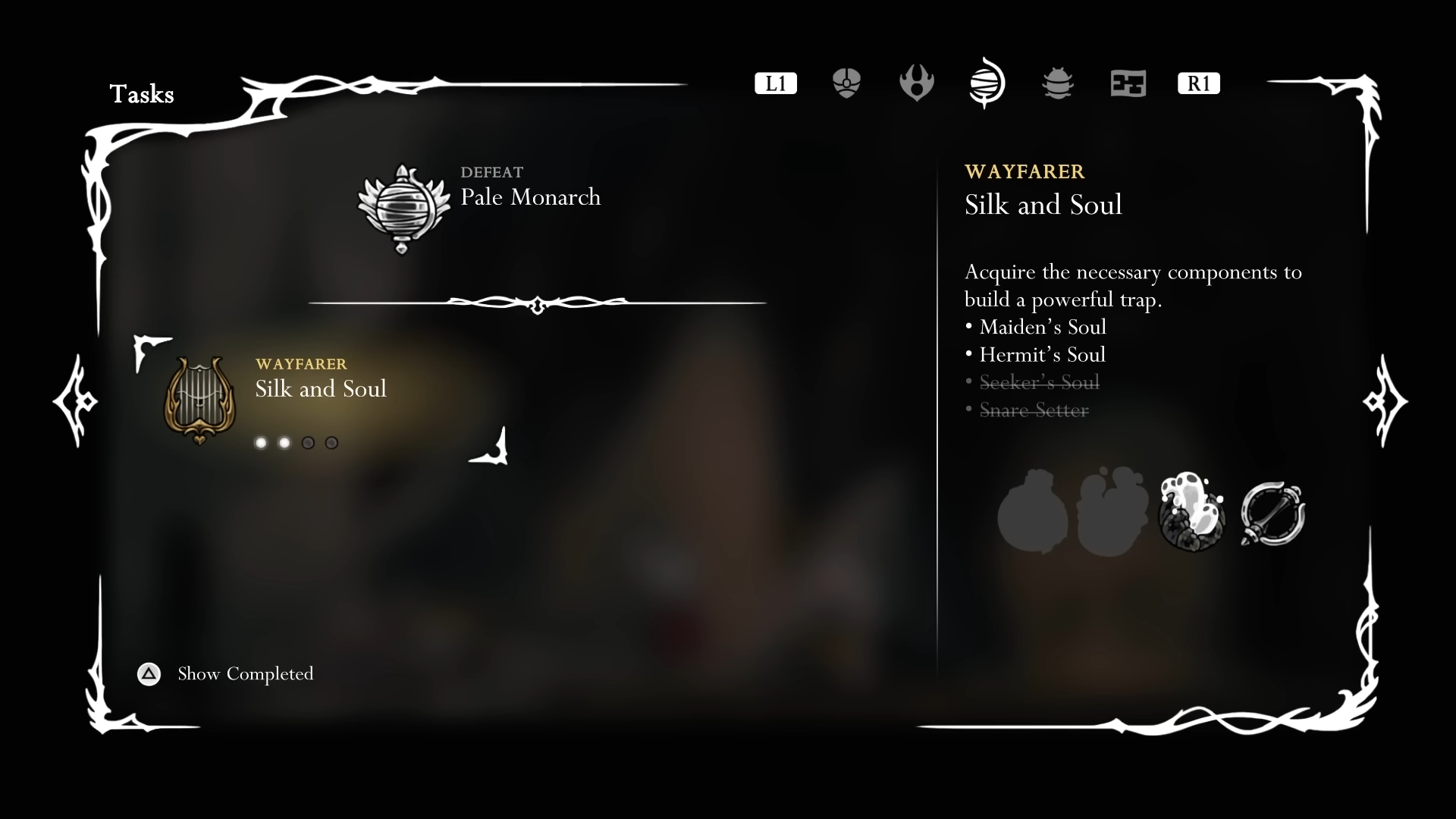 Step 3: Gather 'Silk and Soul' wish components. Get Maiden's Soul from Bone Bottom (may require second Skull Tyrant fight), Hermit's Soul from Bell Hermit via fake wall in Bellway, Seeker's Soul from Bilewater's abandoned bellhome, and Snare Setter from Weavenest Atla.