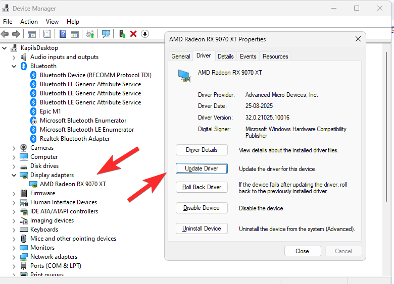 Expand the Display Adapters section and right-click your graphics card and select Properties. Next, selct Update Driver.