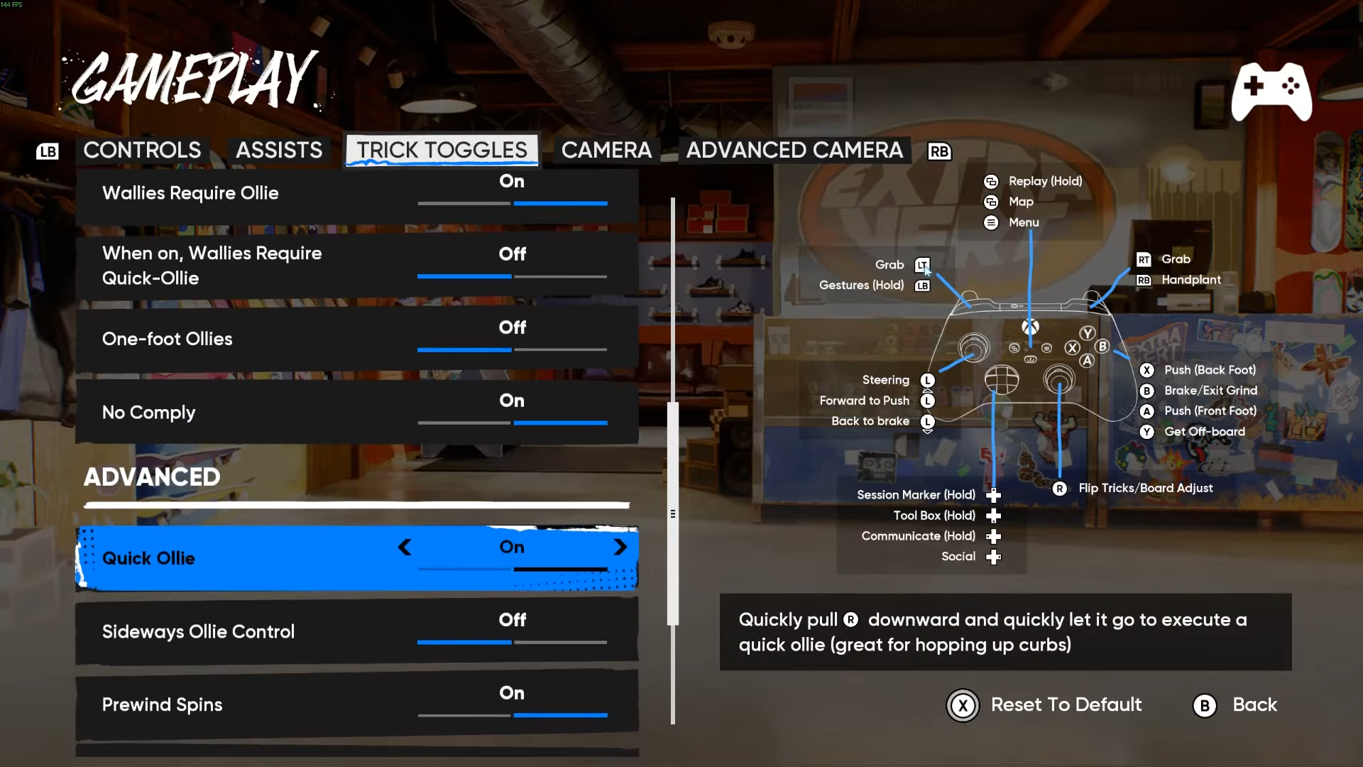 Before attempting the trick, open the start menu, go to Settings, then Gameplay, and navigate to Trick Toggles. Make sure "No Comply" and "Quick Ollie" options are enabled. Quick Ollie is performing an ollie with a stick flick down and release.