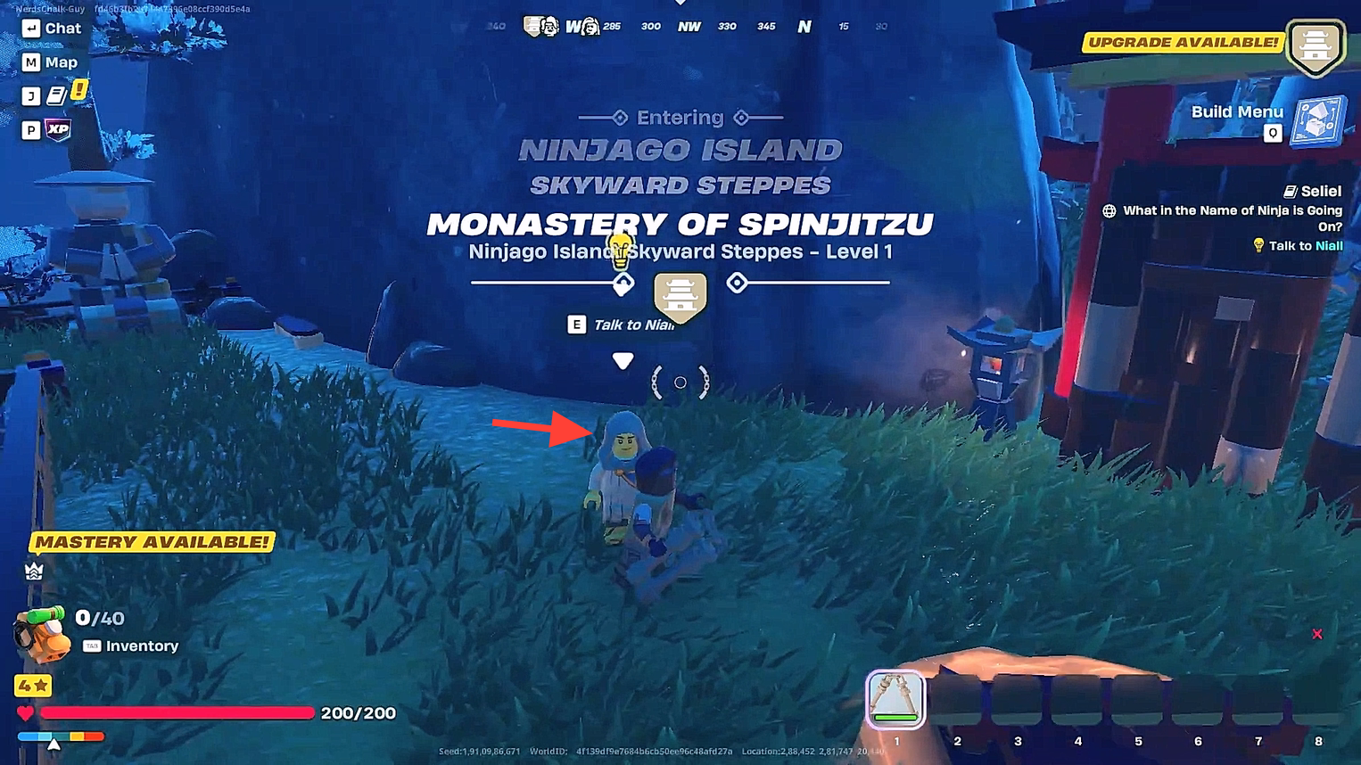 Click on the Play on the homescreen to connect to a world and start playing. You will enter the Skyward Steppes on Ninjago Island. The game will start at the Monastery of Spinjitzu. Talk to Nial to proceed.