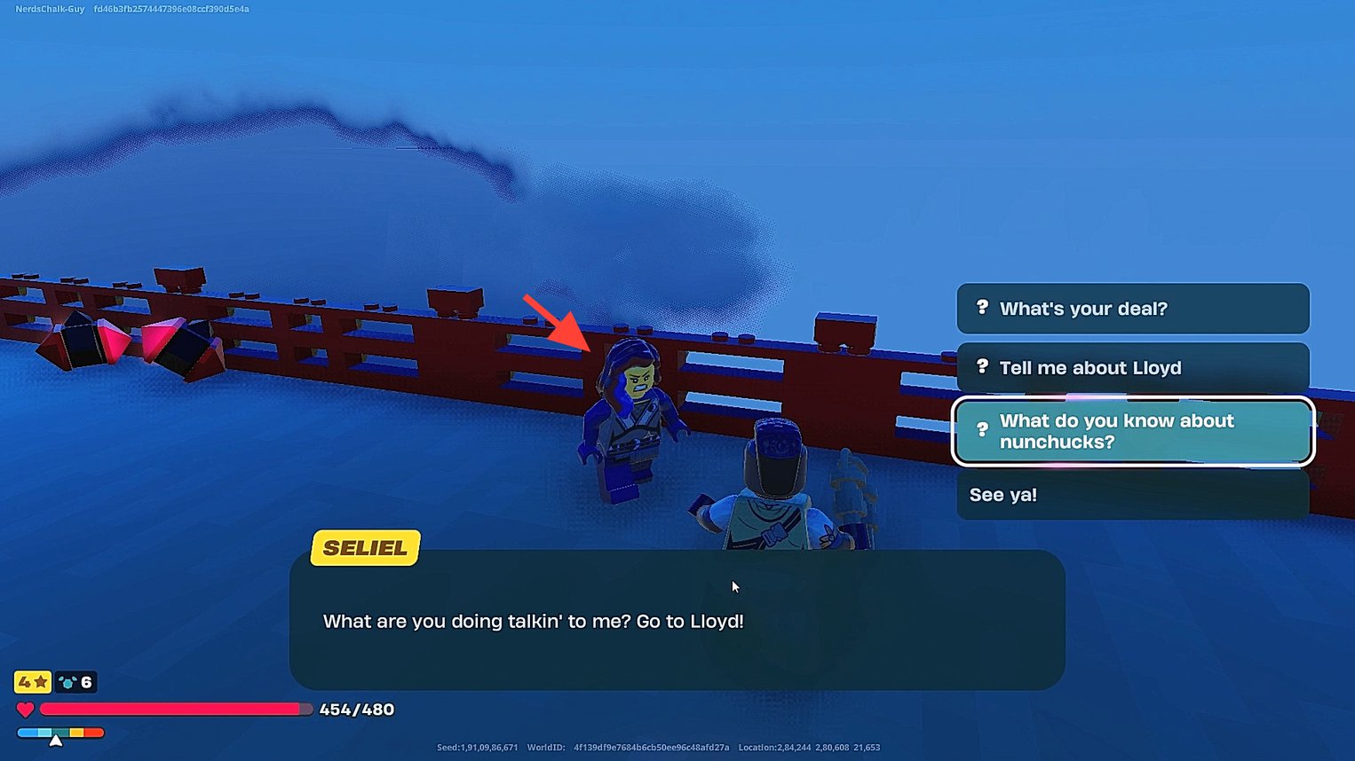 Talk with Seliel about Lloyd, the nunchucks and her deal. At the end of the conversation, she will ask you to go to Lloyd.