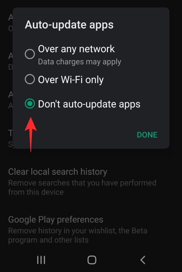 First, go to the Google Play Store and disable Auto-update apps. Tap the hamburger menu in the top left corner then go to Settings > Auto-update apps and disable the function.