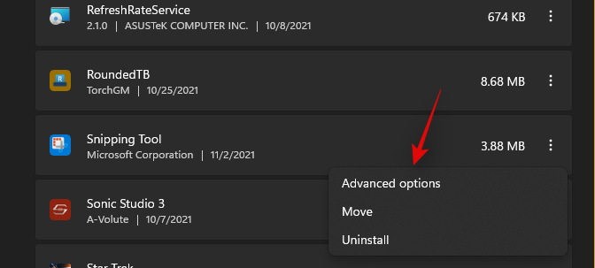 Find Snipping Tool in the current list and click on the 3-dot menu icon beside it.