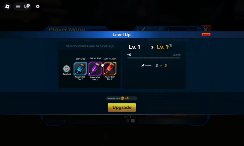 - A “Level” or upgrade option where Power Cells are consumed to add EXP/levels.