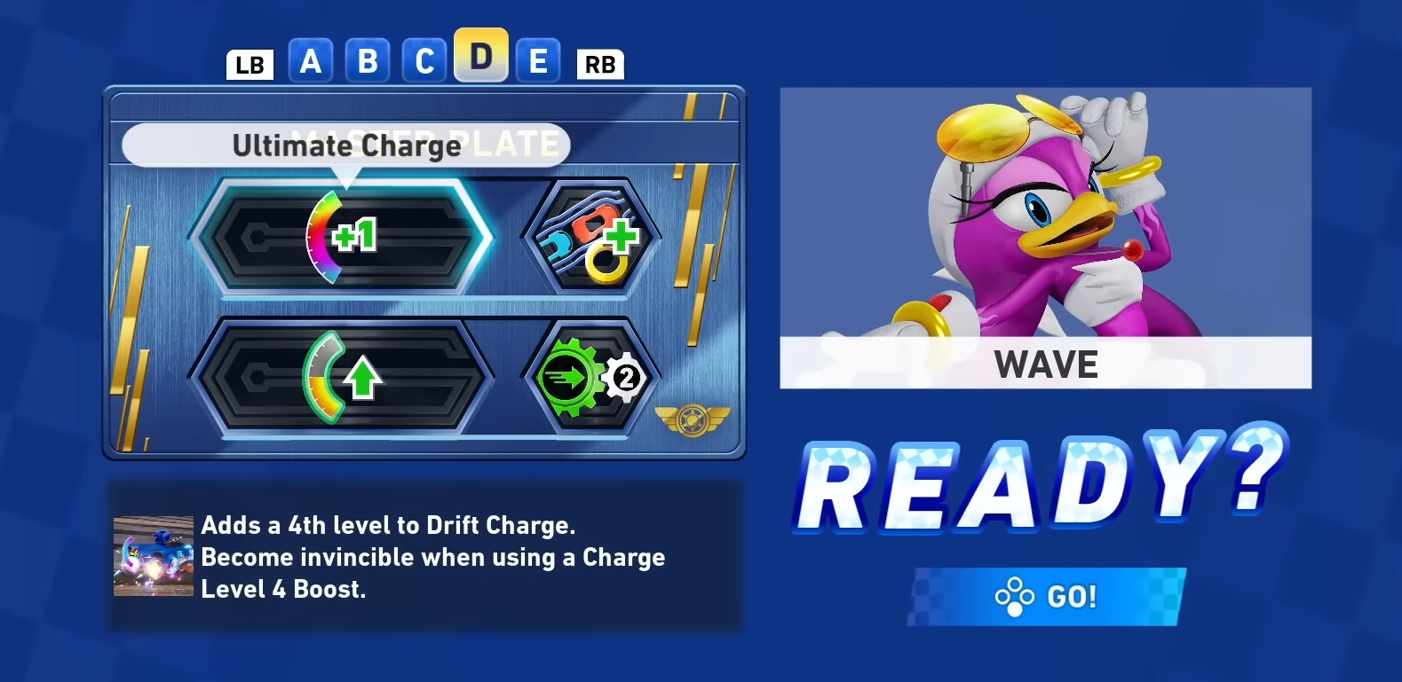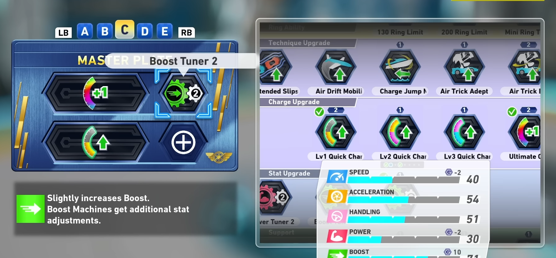 Recommended gadgets include Ultimate Charge for temporary invincibility frames, Quick Charge for faster boost buildup, Boost Tuner to enhance boost stats, and Slipstream Bounty to generate more rings when drafting opponents.