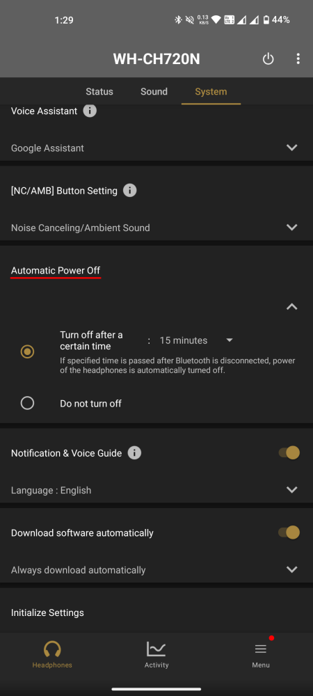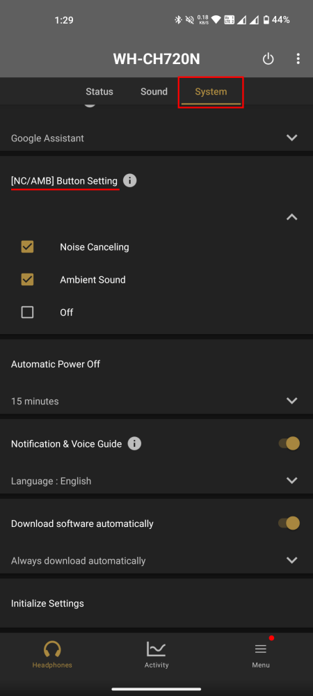 The same ‘System’ page lets you select your Voice Assistant, choose what the noise cancellation/ambient sound button does, and determine how long the headphones remain active before they’re turned off (if at all).