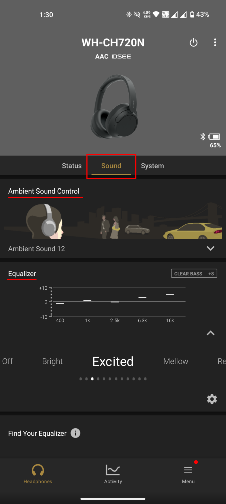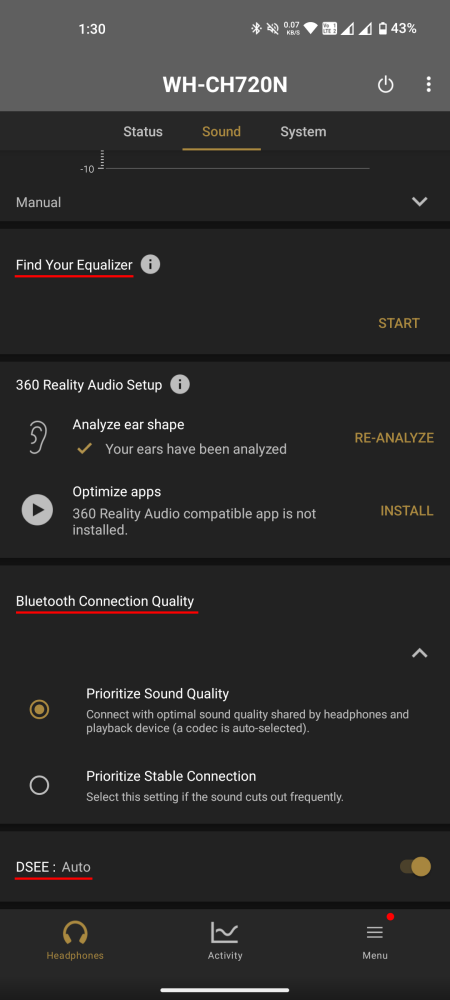 The ‘Sound’ page is where most of your audio tweaking will take place. Ambient Sound Control lets you manually select between Noise Cancelling, Ambient Mode, and Off. The EQ section lets you tweak the audio and determine the level of ‘Clear Bass’. Further down, under ‘Bluetooth Connection Quality’, you can choose between prioritizing sound or connection, as well as enable Digital Sound Enhancement (DSEE).