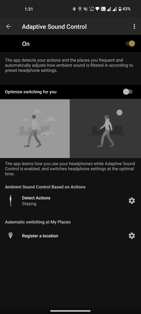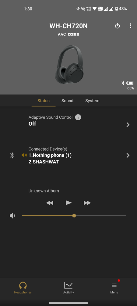 The ‘Status’ page displays the devices the headphones is connected to, the media playing, and lets you enable Adaptive Sound Control that, if you like, can learn your listening habits and adjust the settings accordingly.