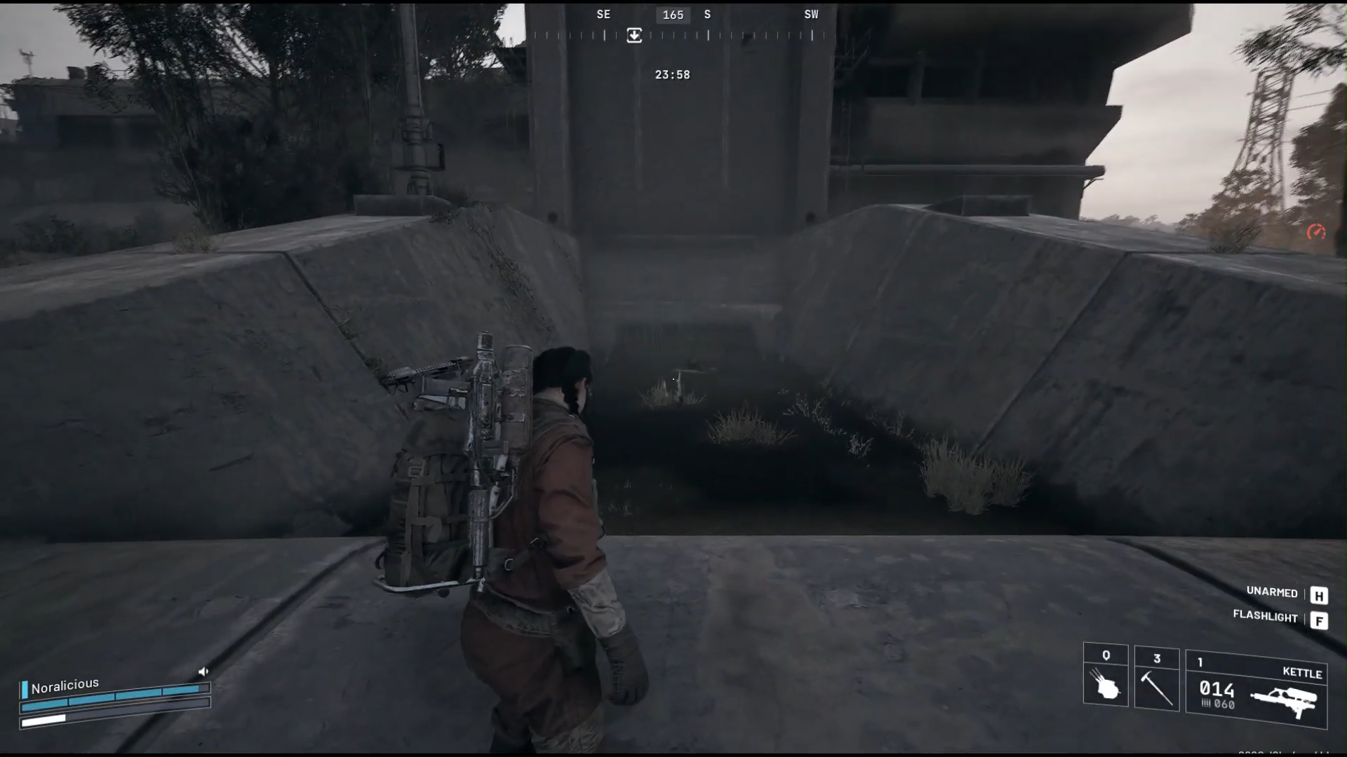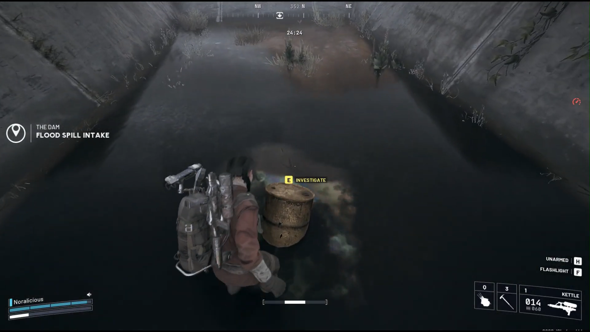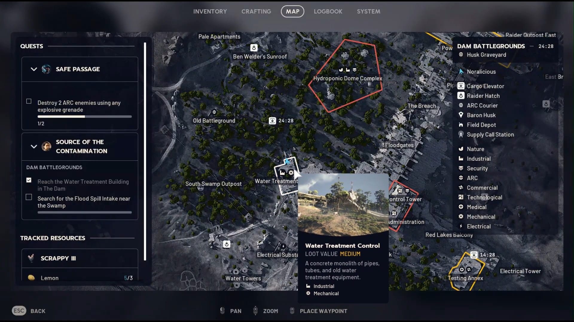 This quest takes place within the Dam Battlegrounds area. Begin near the base of the Dam, where old maintenance roads and pipes lead upward to the Water Treatment Building — a tall structure overlooking the spillway. After checking inside, descend through the drainage tunnels and follow the water’s path toward the Swamp area, where the Flood Spill Intake is located, partially submerged under murky water and surrounded by debris.