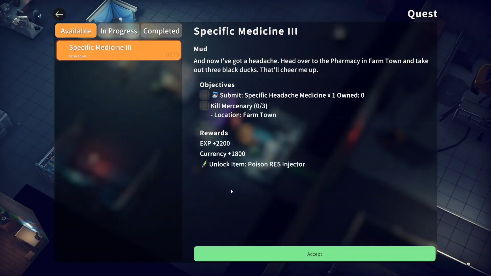 This quest is given by Mud in Farm Town. It involves crafting and submitting a specific medicine while eliminating mercenaries. Completing it grants XP, currency, and an injector unlock.