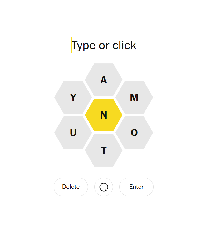 This hive centers on N and surrounds it with a compact, vowel-friendly set. It’s the kind of grid that rewards secure anchors and then patient stretching — short, reliable words will quickly point to longer forms. Try building from small N-roots and experiment with adding vowel repeats or common suffixes; once you find a couple of seeds, the rest tends to follow.