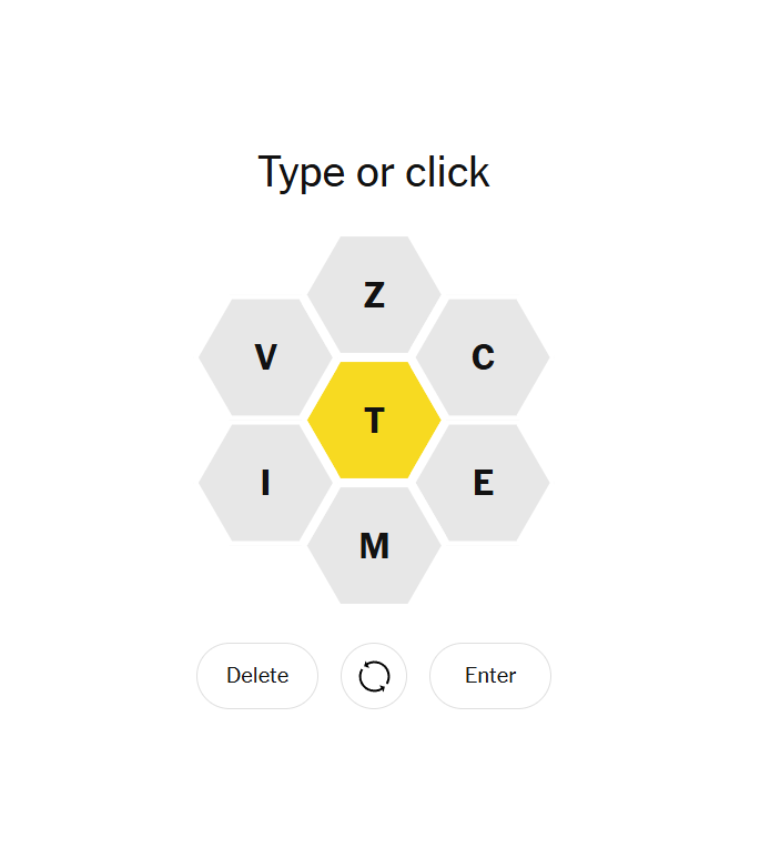 This hive has T in the center with a tight cluster of consonants and a couple of vowels. It rewards stem-first play: secure a few reliable four-letter anchors that include T, then try to extend them with the available vowels or the rare Z to reach longer, higher-value words. The letter mix favors verbs and noun forms built from the same root (item / itemize, victim / victimize, etc.), so once you spot a seed, many siblings often follow.