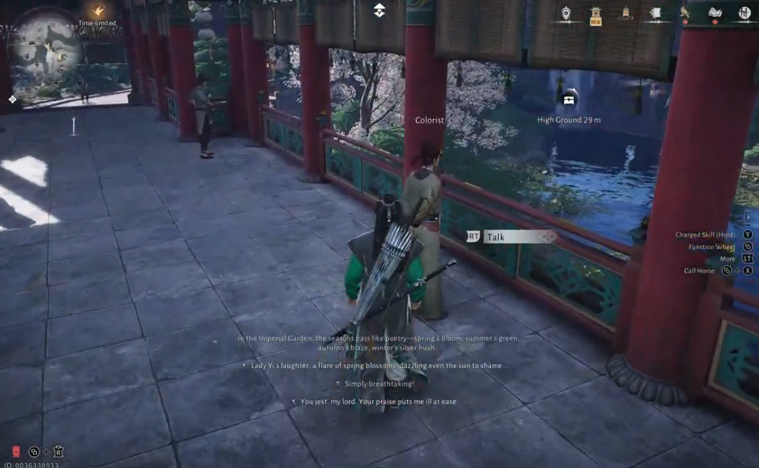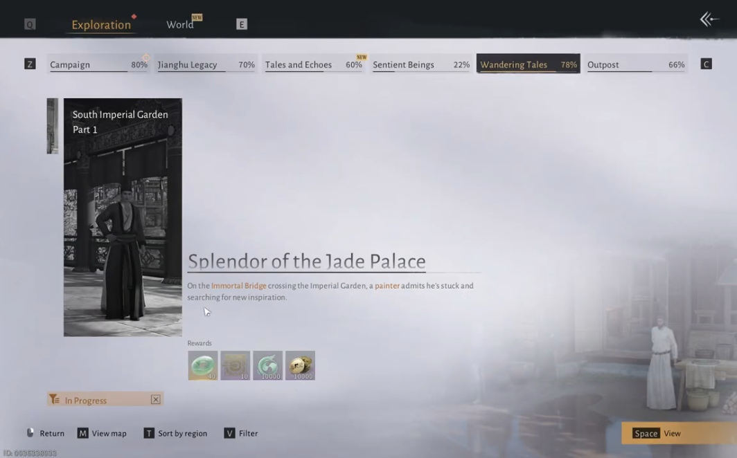 You can begin Splendor of the Jade Palace at the Immortal Bridge in the Imperial Garden. There, you’ll find a painter standing by the railings, staring at the landscape in search of fresh ideas. Speak to him to initiate the Wandering Tale.