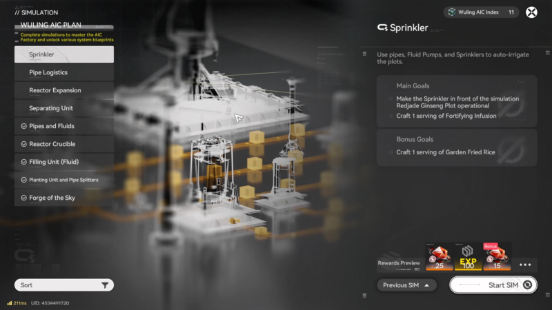 Fluid Sprinkler (AIC node)Unlocks Sprinkler constructionFound in AIC Planning; typically under Logistics, Wuling I; research cost is 2 Index Points.