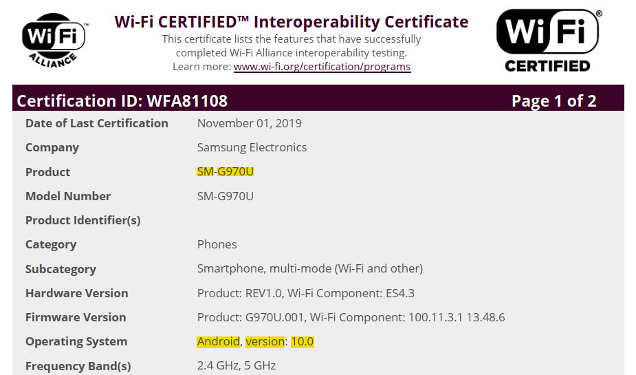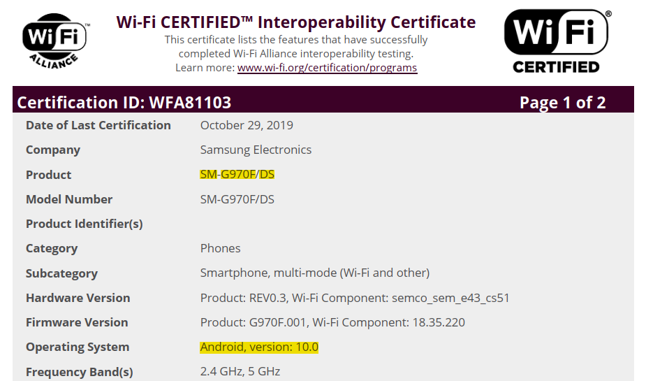 Here are some screenshots fo the Galaxy S10e’s Android 10 update being certified at Wi-Fi Alliance. And one of the Galaxy S10 5G. We are not adding screenshots for all the variants of the four Galaxy S10 handsets because of an obvious reason: it doesn’t make sense to add them all here.