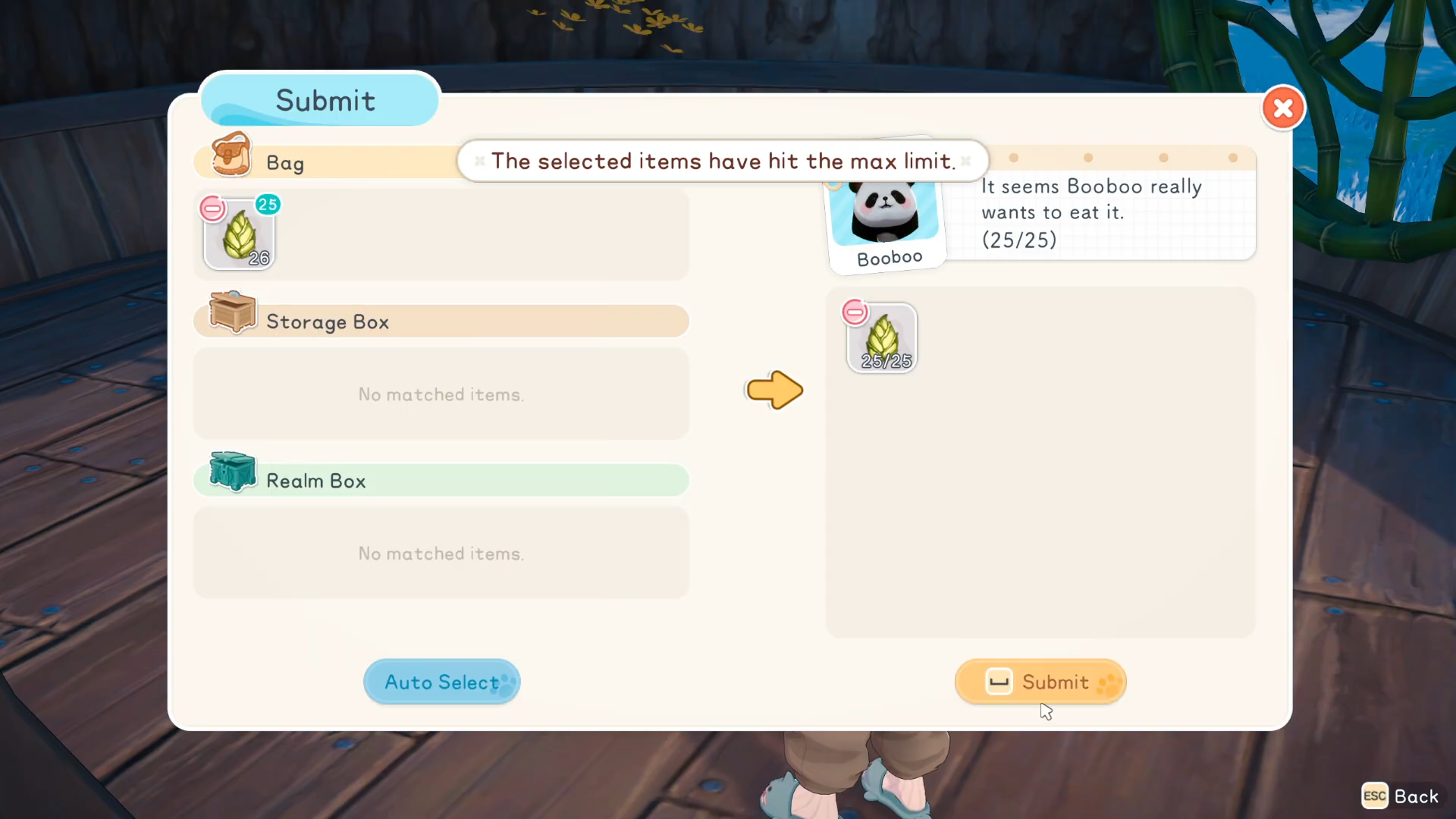 Select and give 15 bamboo shoots directly from your inventory.