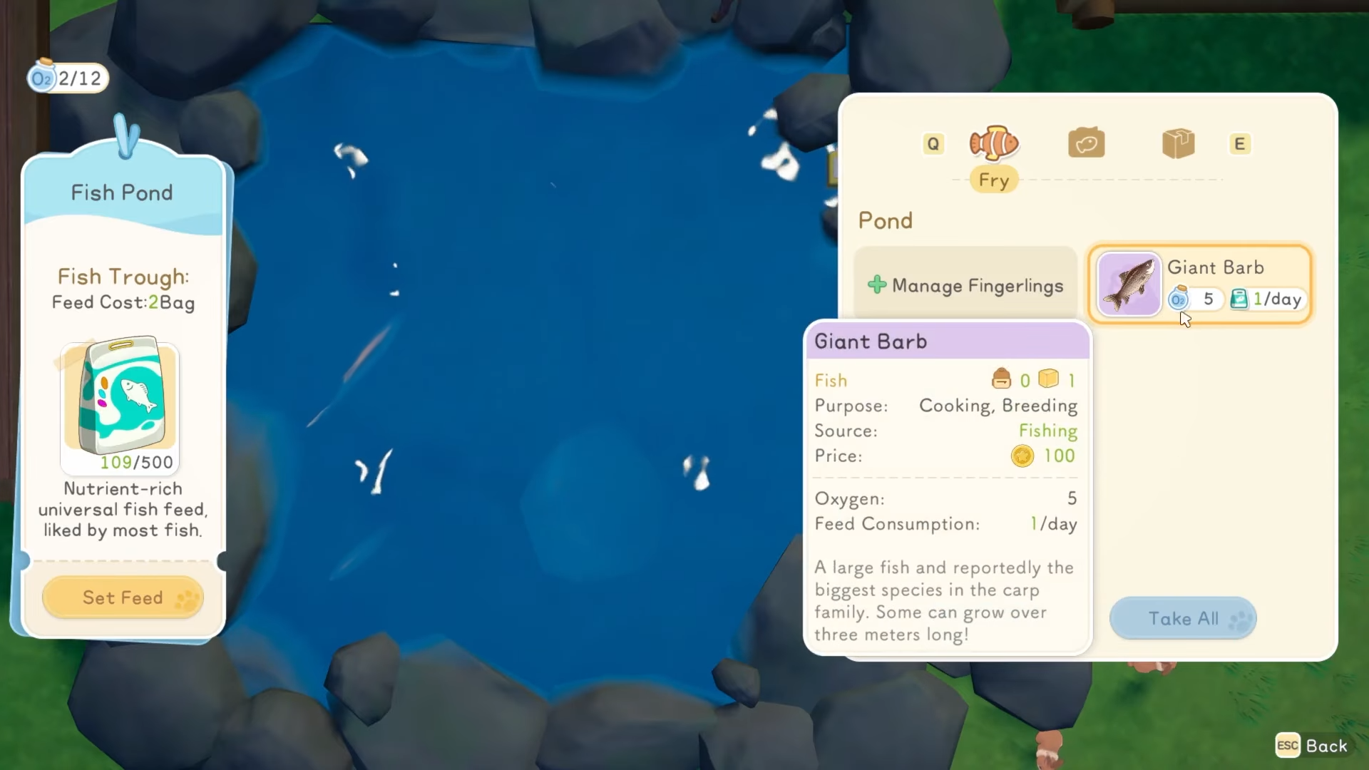 Once you have at least two Giant Barbs, place them into a fish pond and make sure it’s stocked with fish food. Giant Barbs take up a lot of pond capacity, so confirm the pond can fit two before you commit.