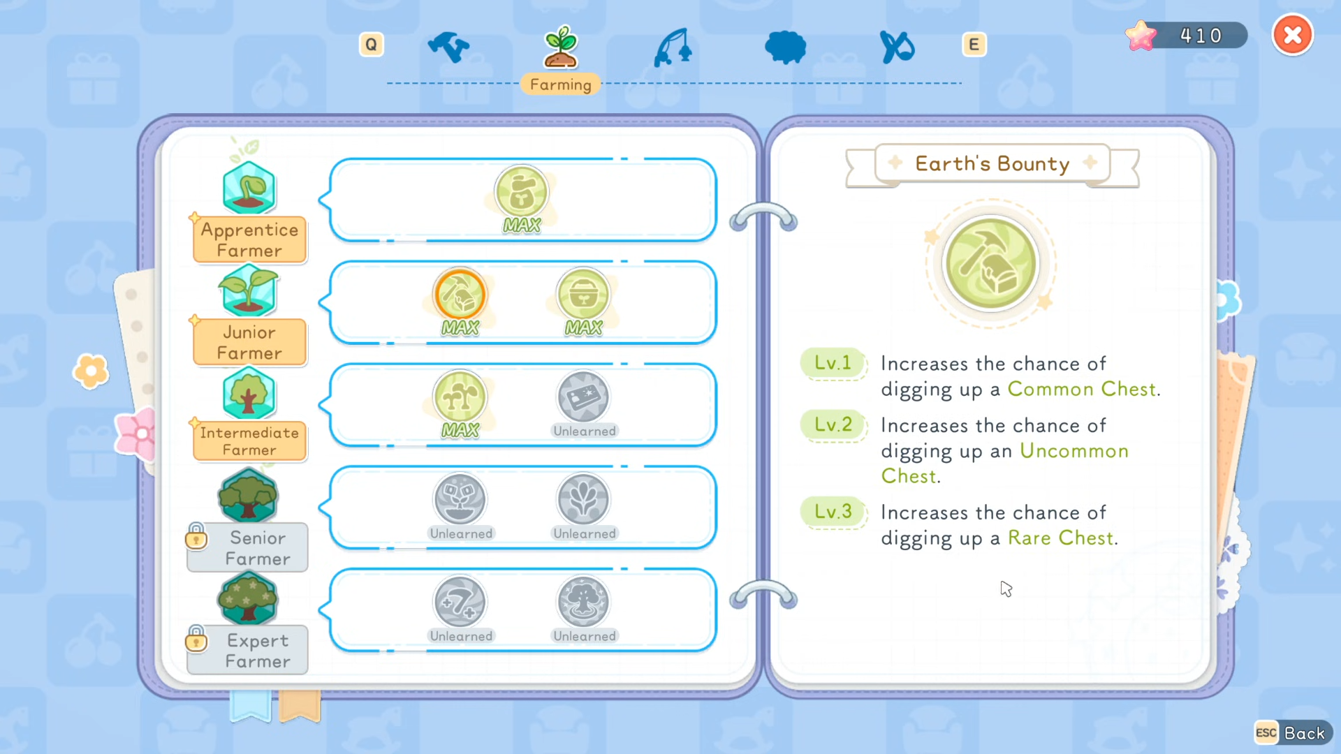 Start by checking the Workpipedia for farming skills. Focus on Junior Farmer to access Earth’s Bounty and max it out right away. This gives you the ability to spawn chests during routine hoeing.