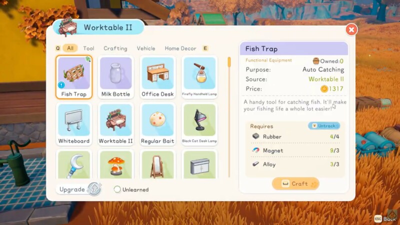 When unlocked, head to Worktable II, where the Fish Trap appears under the functional equipment section. Crafting a single trap requires the following materials: