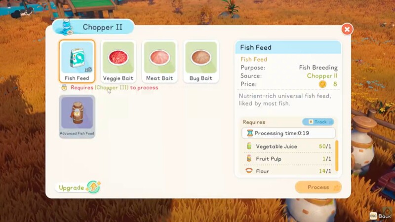 Advanced Fish Food is processed through Chopper III, meaning you must upgrade your chopping station before producing it. The processing time is short, approximately 19 in-game minutes, making bulk production manageable.