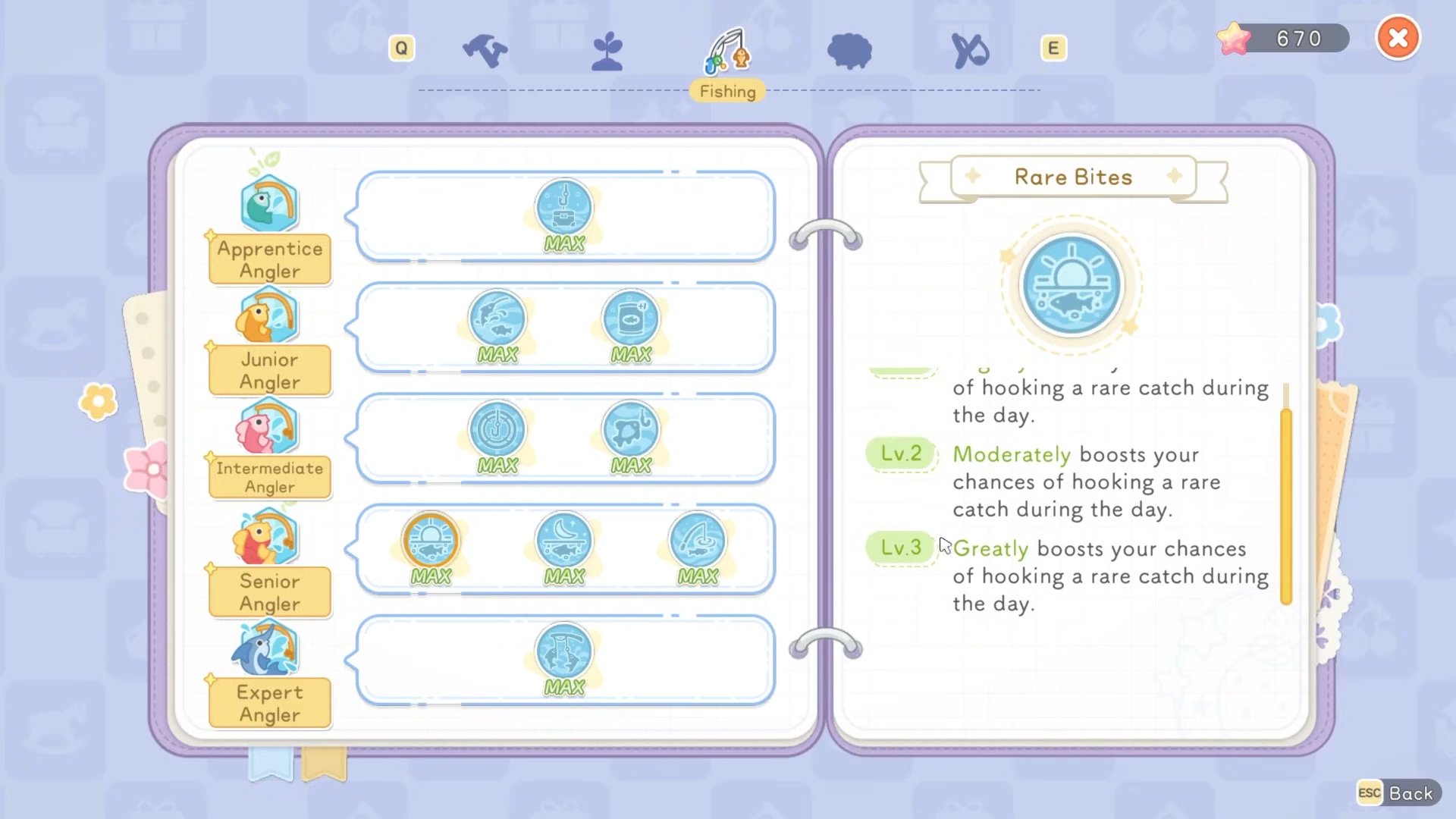 Unlock Rare Bites to increase your chance of hooking rare fish during the day.