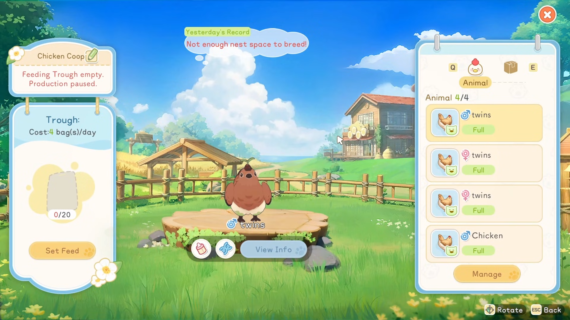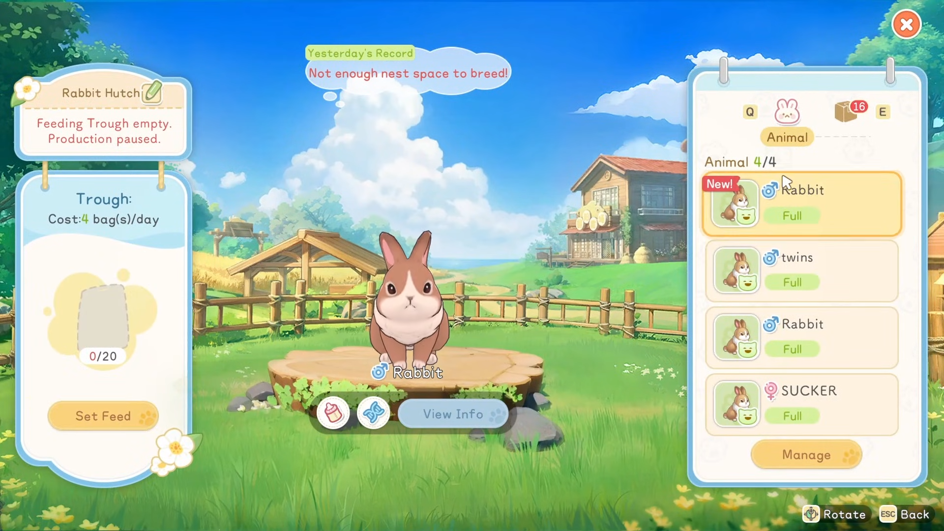 High affection leads to extra resources and task assistance—rabbits clear weeds, chickens eat bugs, ducks handle snails. Traits like Workaholic or Twins from breeding enhance output.