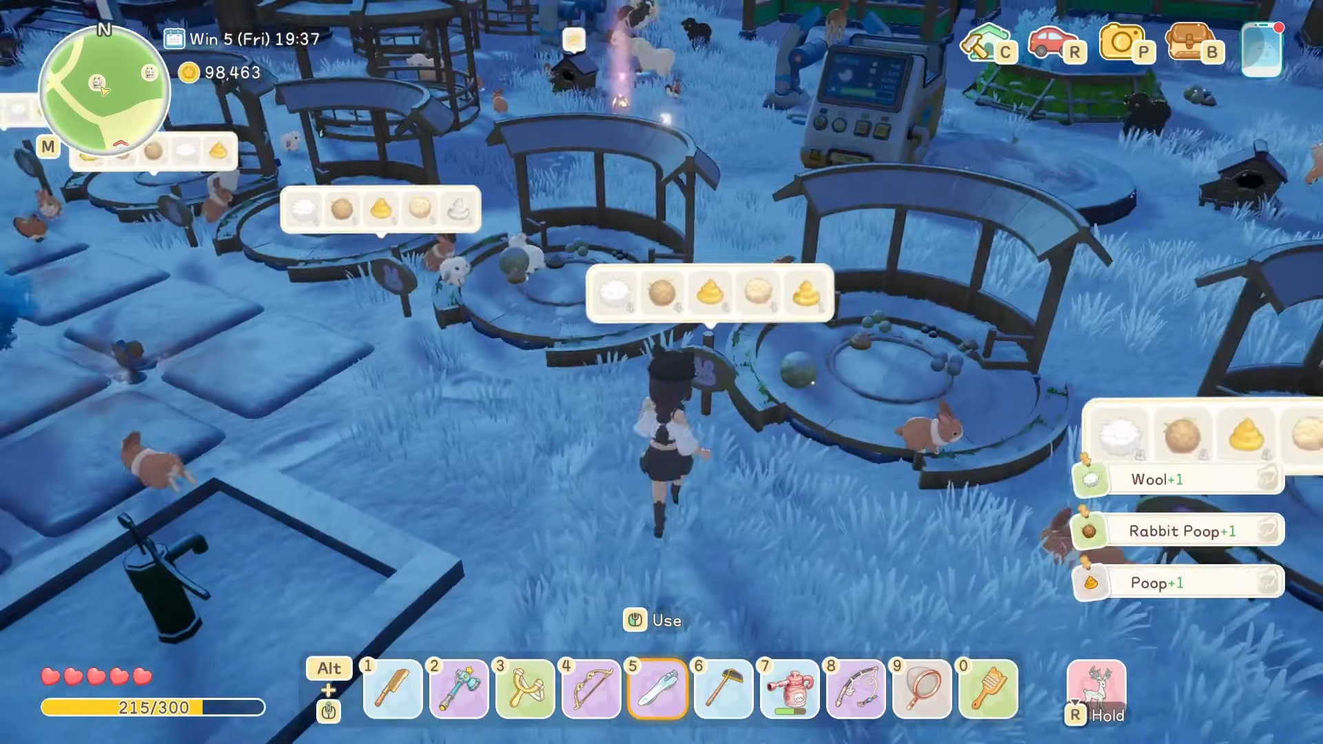 Collect poop, products, and monitor happiness for optimal farm help.