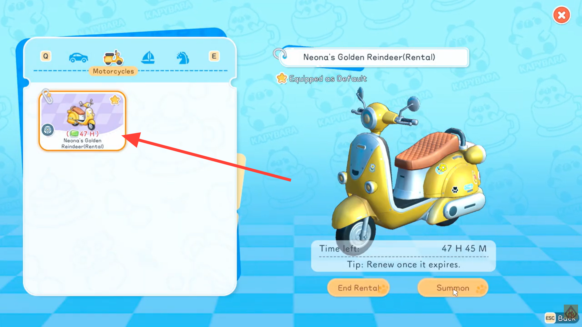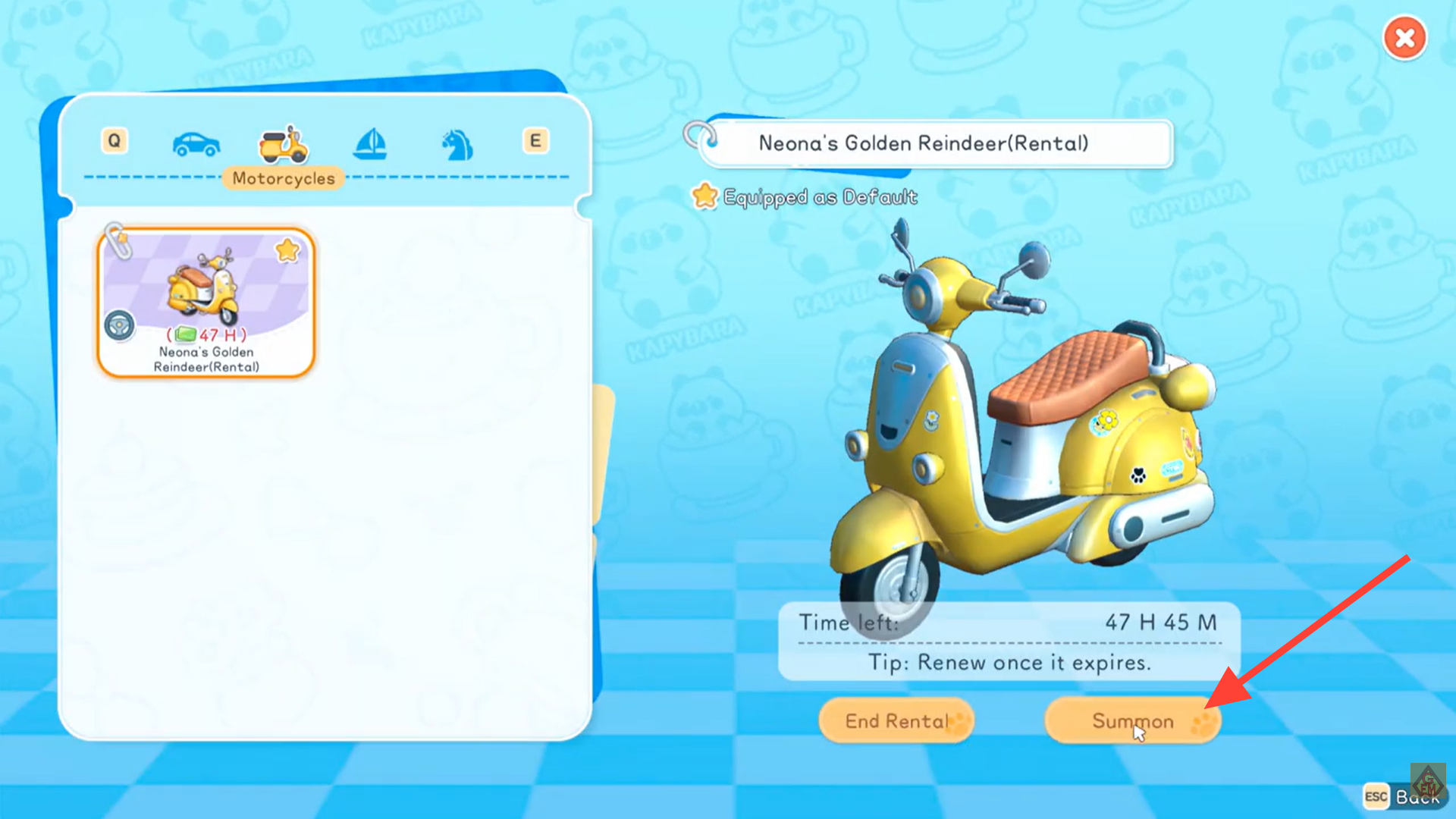 Select the rented vehicle to view its remaining time, management options, and summon controls.