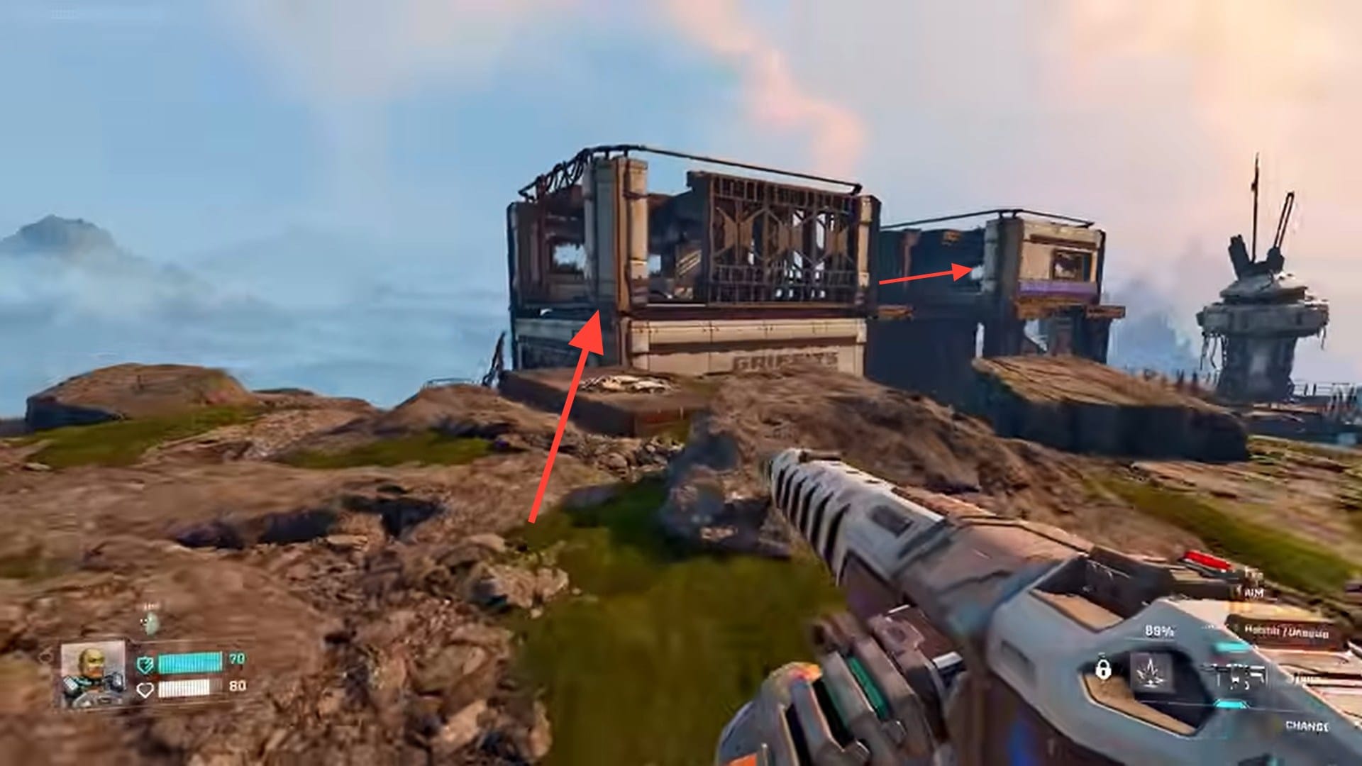 From your landing area, look for a research facility sitting high on a nearby mountain. Head directly toward it, using natural slopes and ledges to climb up.