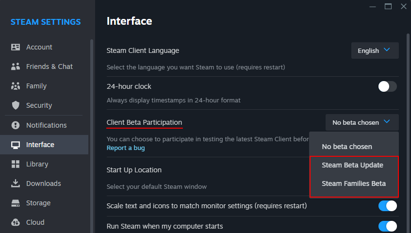 - Click on Interface on the left. On the right, click on the drop-down menu next to Client Beta Participation and select either of the two Steam Beta options (Steam Beta Updates or Steam Families Beta).