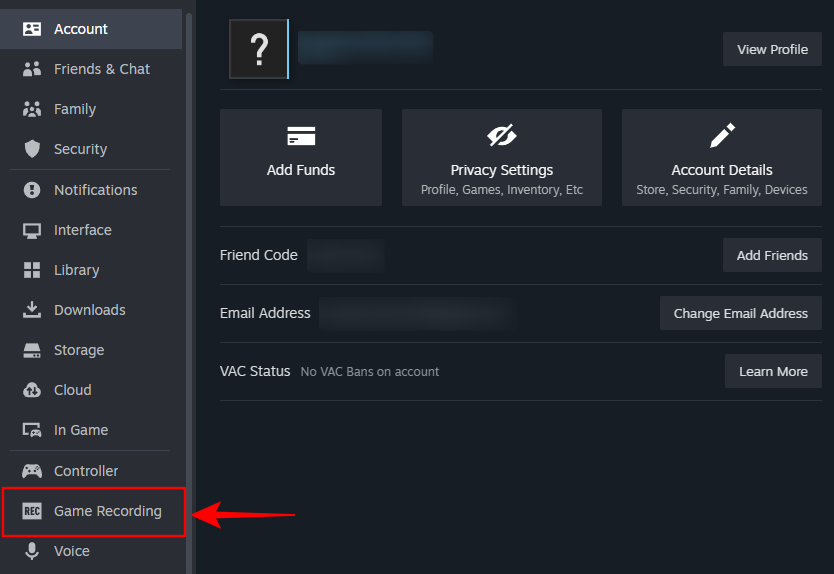 - Open Steam Settings again. You will see a new Game Recording option on the left.