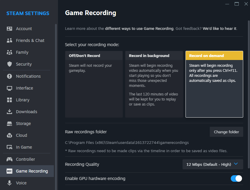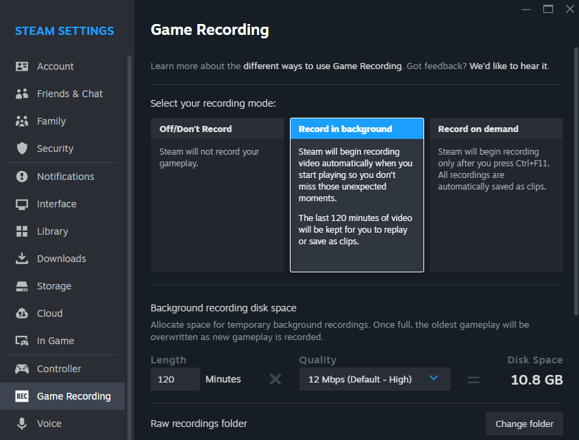 - Steam’s Game Recording function gives you two options – Record in background and Record on demand.