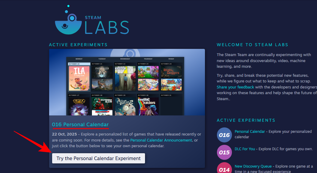 - The feature appears as “Experiment #016 Personal Calendar” in Steam Labs.