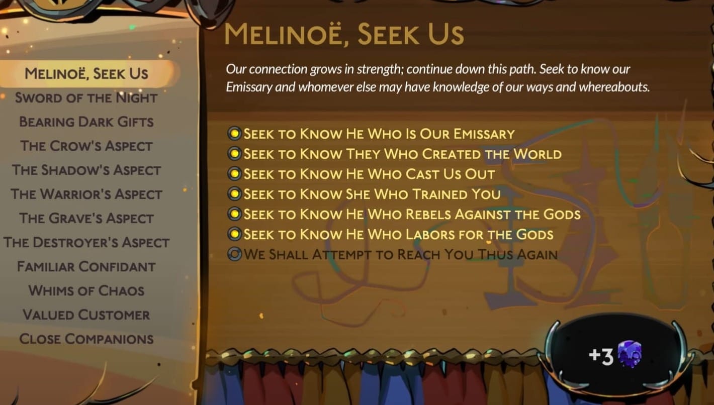 | Labor for the gods | Hermes / Charon | Use shrines, spend Obol points, progress bonds |